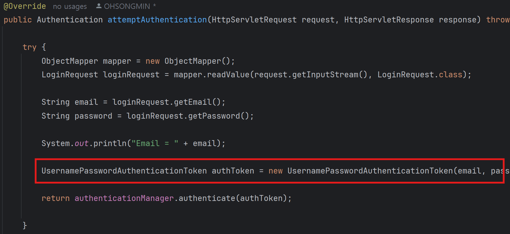 UsernamePasswordAuthenticationToken을 생성한다. 이 토큰은 인증 시도(attemptAuthentication)에 사용된다. - AuthenticationManager