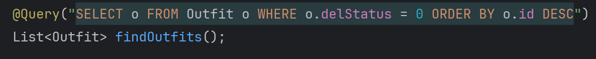 위의 예시에서 `updateOutfit` 메서드는 특정 Outfit 엔티티르 조회하고, 해당 엔티티의 delStatus 컬럼을 변경한다.